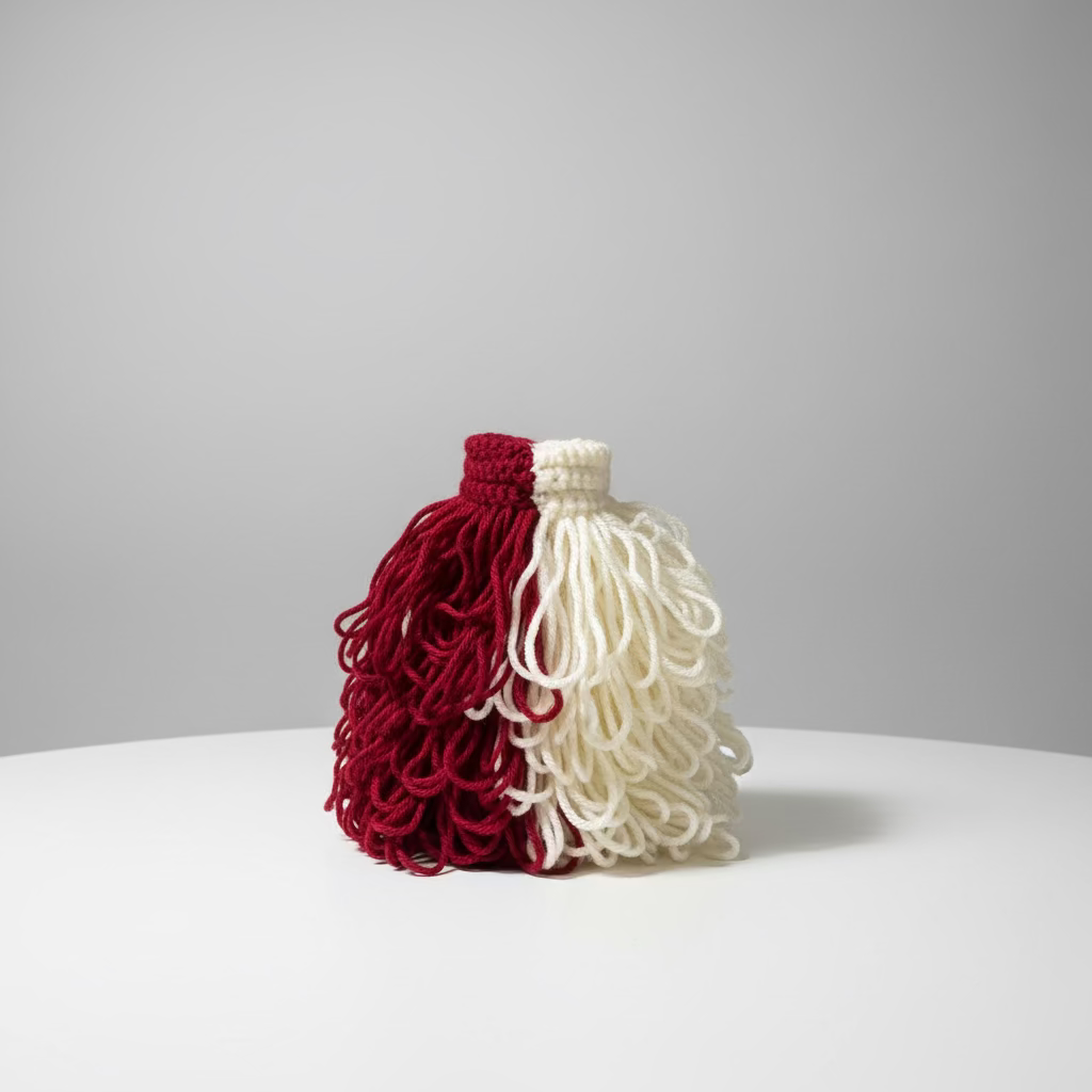 Our crimson and cream handmade clutch bag is made of an acrylic, cotton, polyester, blend and/or other fibered yarn.