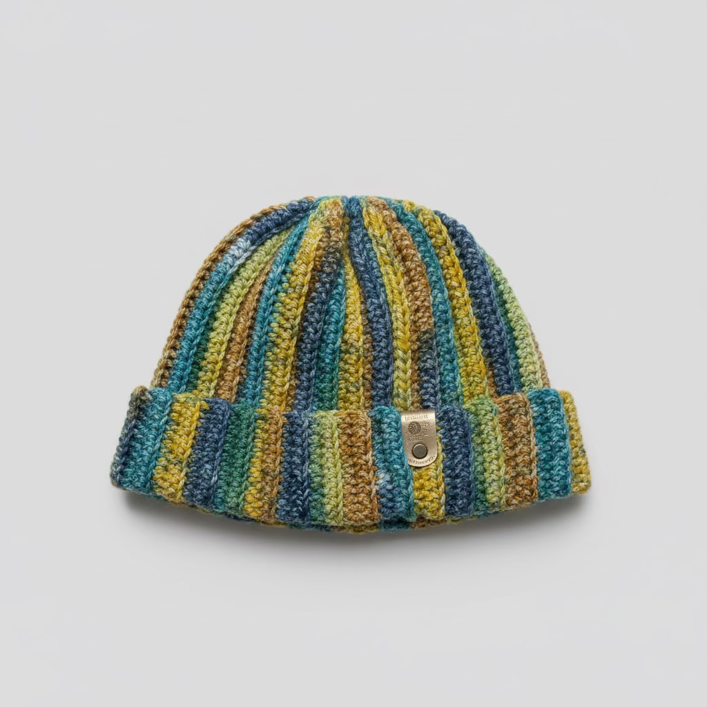Fitted beanie with hues of yellows, blues and greens. Fits 22"-26" comfortably. Each hat is individually unique and cannot be duplicated. Shades may differ slightly due to lighting.