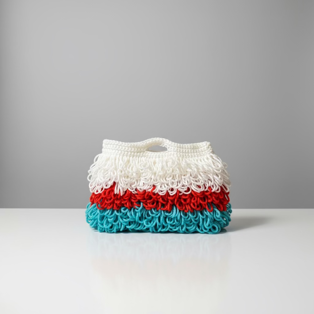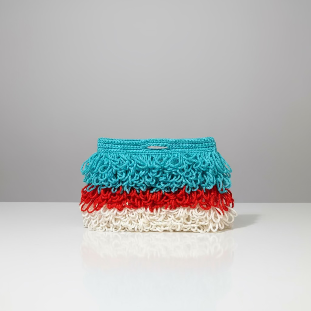 Our Columbia blue and red (with white) handmade clutch bag is made of an acrylic, cotton, polyester, blend and/or other fibered yarn.