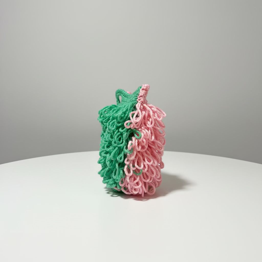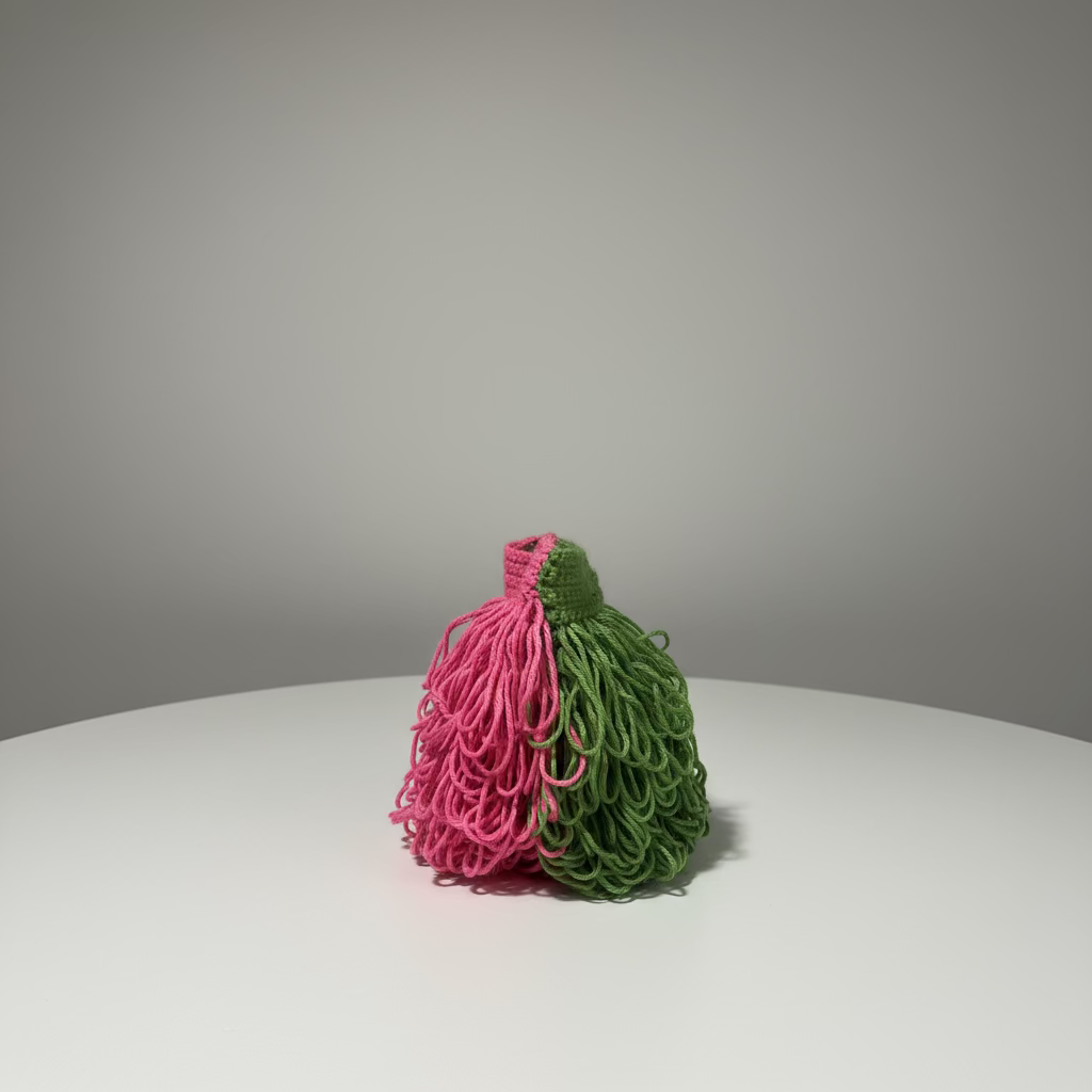 Our pink and green handmade clutch bag is made of an acrylic, cotton, polyester, blend and/or other fibered yarn.