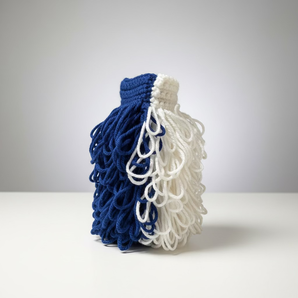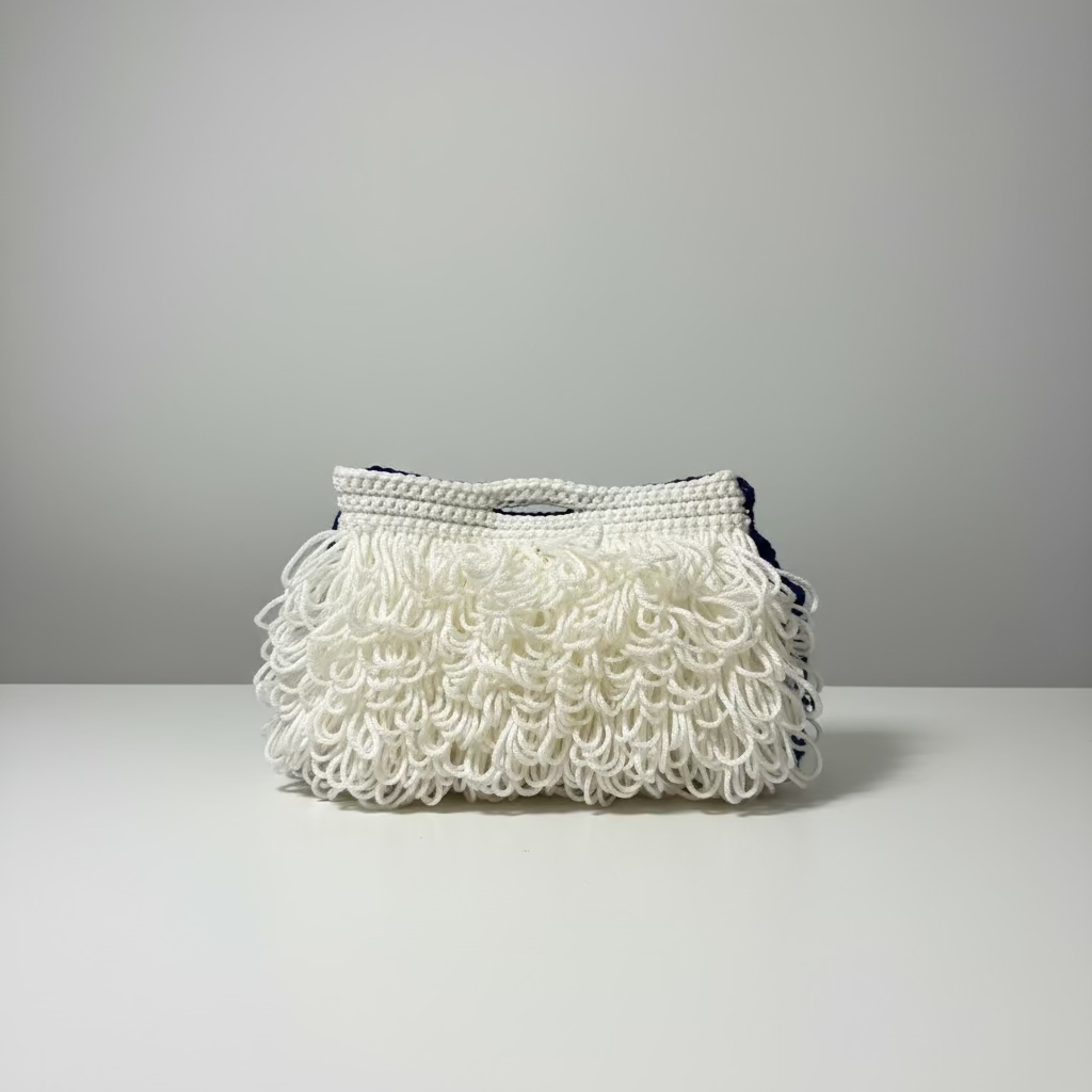 Our royal blue and white handmade clutch bag is made of an acrylic, cotton, polyester, blend and/or other fibered yarn.